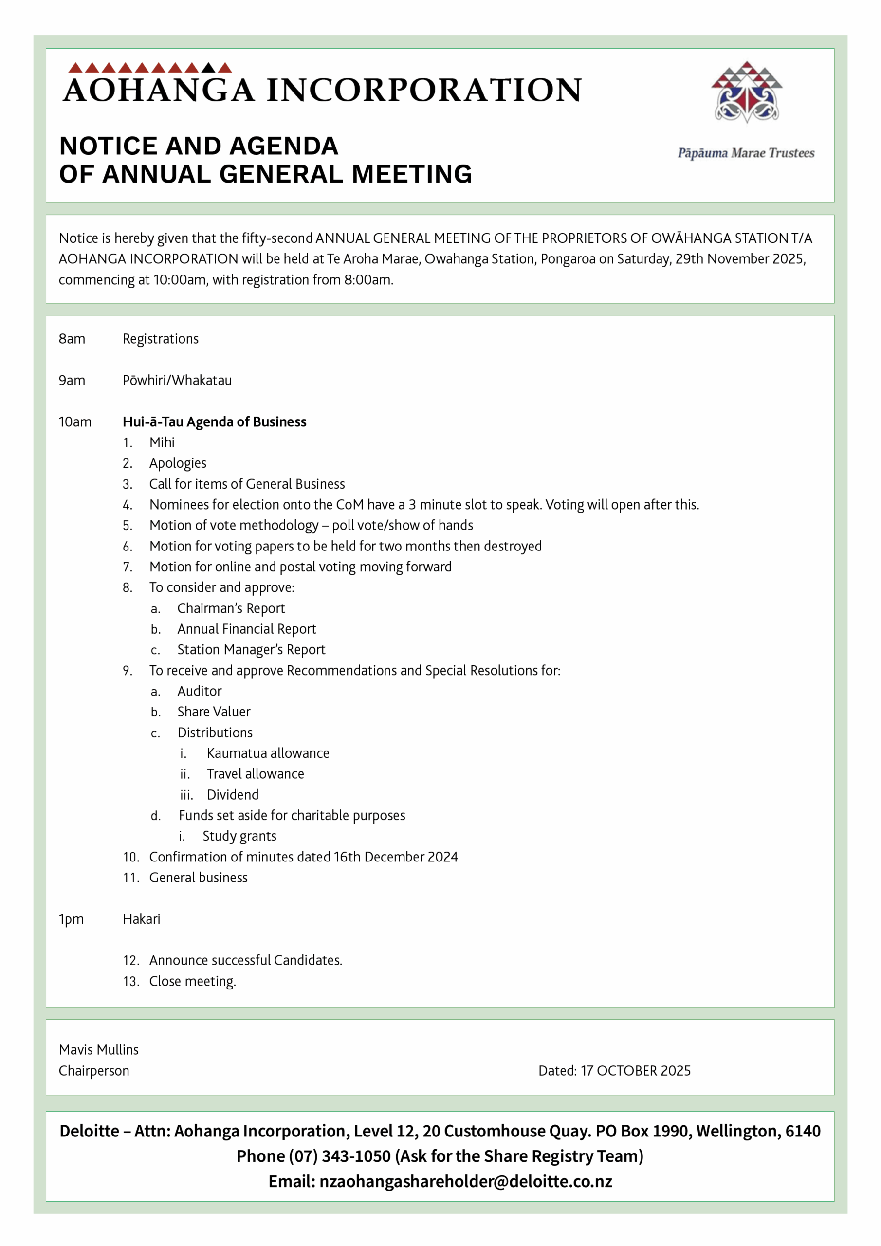 On behalf of the Committee of Management of the Aohanga Incorporation, Pāpāuma Marae Trustees, we welcome you to our webpage, though there is much more work to be done.